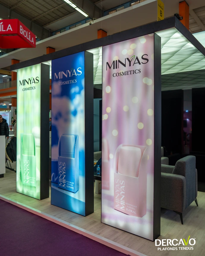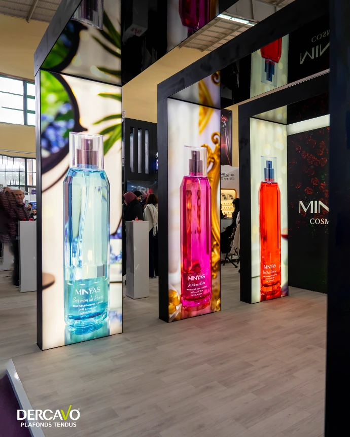 Un stand Dercavo est une structure modulaire et sur mesure, conçue pour répondre aux exigences les plus élevées des salons, expositions et événements professionnels. Chaque stand repose sur une combinaison unique d’aluminium robuste et de toile tendue haut de gamme, permettant d’obtenir une surface parfaitement lisse, uniforme et esthétique, tout en conservant la légèreté et la modularité nécessaires à un transport et un montage faciles.